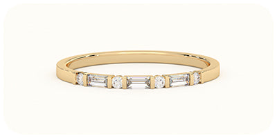 A baguette diamond is a rectangular-shaped gemstone with straight or tapered edges and step-cut facets. Known for its sleek and elegant appearance, the baguette diamond is often used as an accent stone in engagement rings, wedding bands, or eternity rings. The clean lines and minimalist style of baguette diamonds provide a modern, understated sparkle that enhances the overall design of the jewelry.