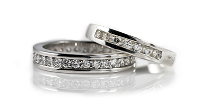In a channel setting, gemstones are set between two parallel metal walls, creating a seamless line of sparkle along the band. This setting style is commonly used in wedding bands and eternity rings, as it provides a smooth, elegant look while protecting the stones from chipping or snagging. The channel setting offers durability and is ideal for those who want a sophisticated design without exposed prongs.