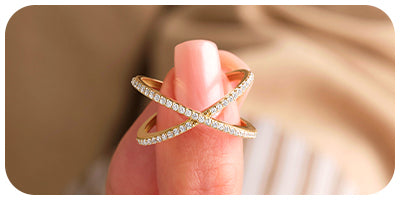 An X ring, also known as a criss-cross ring, features bands that cross over on the top of the finger, forming an "X" shape. This contemporary design adds a modern flair to traditional ring styles and can be crafted as simple bands or enhanced with diamonds or gemstones for extra sparkle.