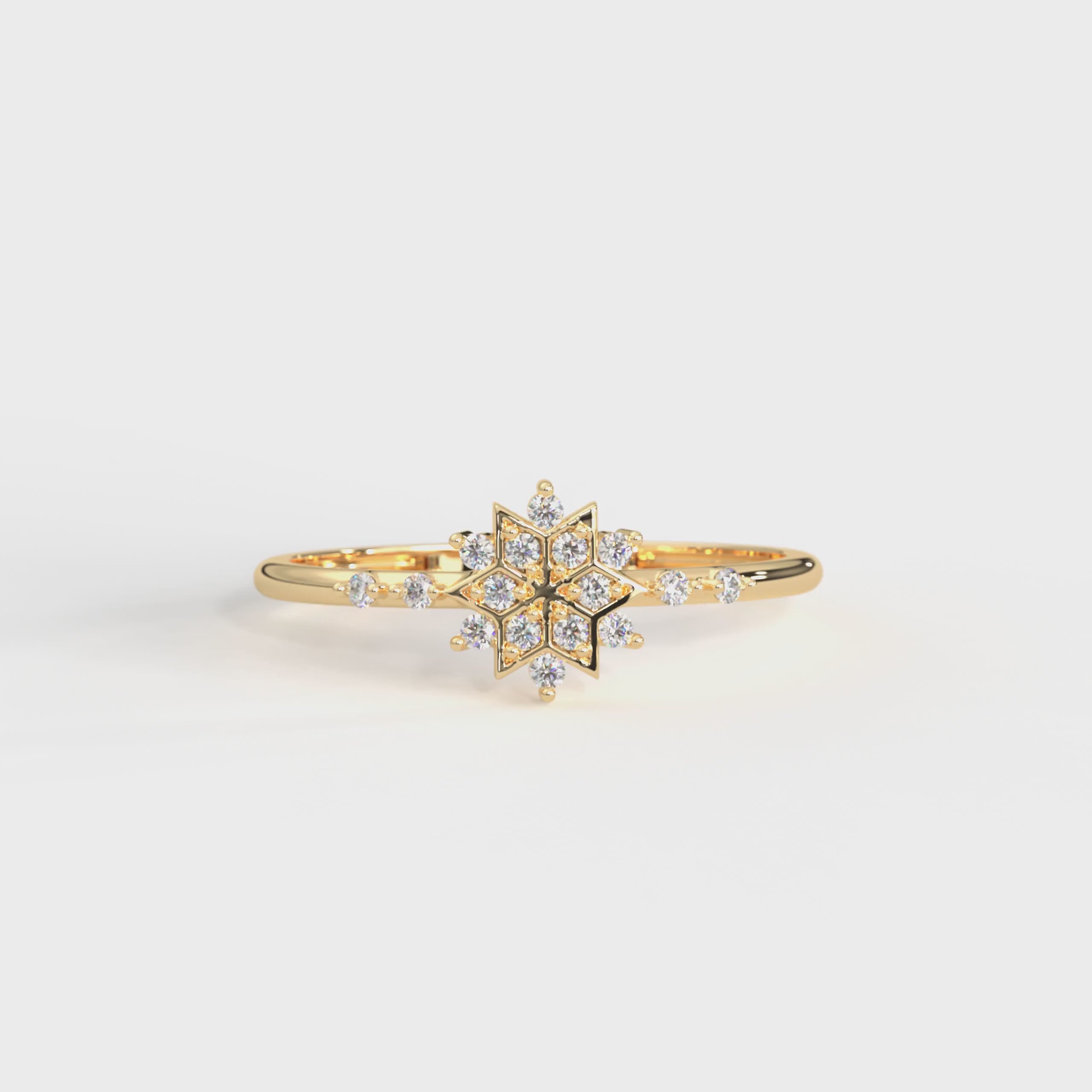 A snowflake ring symbolizes uniqueness and individuality, just like every snowflake is one-of-a-kind. It also represents purity, beauty, and the fleeting nature of time. A gold snowflake ring, particularly one with diamonds, adds an element of elegance and sophistication to this symbolism.