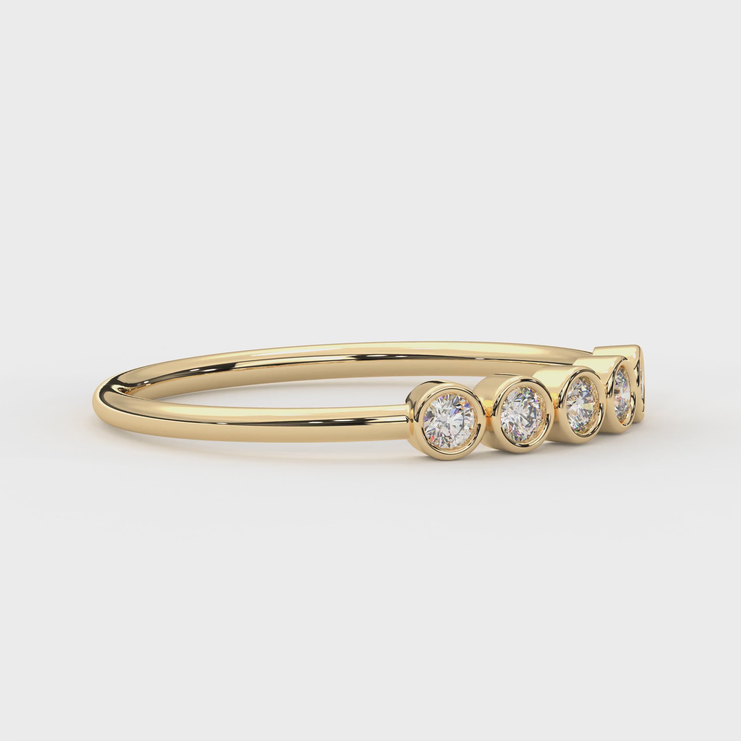 This 18K Gold Bezel Set Engagement Ring combines elegance and simplicity. Featuring a stunning bezel set diamond, this ring ensures the diamond is secure and shines brilliantly. The bezel diamond ring setting gives it a modern and sleek look, perfect for any bride. Bezel set engagement rings are known for their durability and modern appeal. The 5 stone diamond ring design adds extra sparkle and significance, making it an ideal choice for engagements and anniversaries. The 5 stone engagement ring, also known as a five stone ring, represents a journey of love, making it a meaningful gift option.