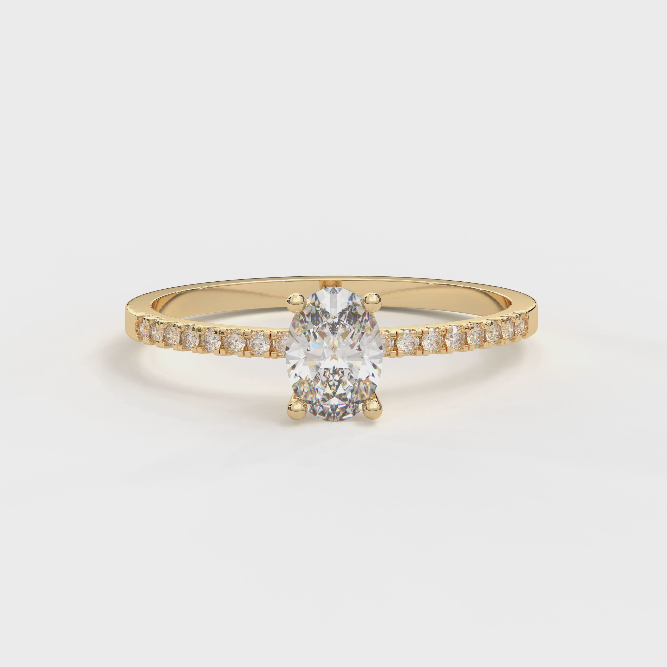 Oval cut diamond is called oval modified brilliant and the Gold oval cut diamond ring uses 57 facets to sparkle under any lighting.